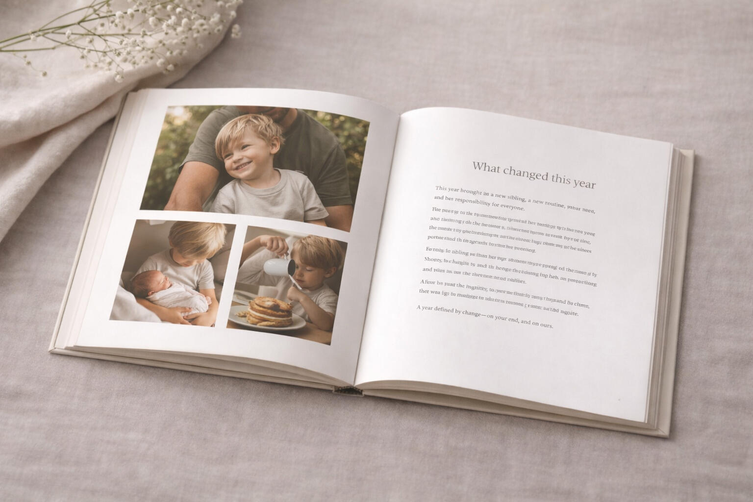 One Book turns a year in your child’s life into a printed hardcover.It isn’t a scrapbook.It isn’t a photo album.It isn’t something you design.It’s a calm, readable record of a year, written as a story and made to last.Most books document moments. This records a year.